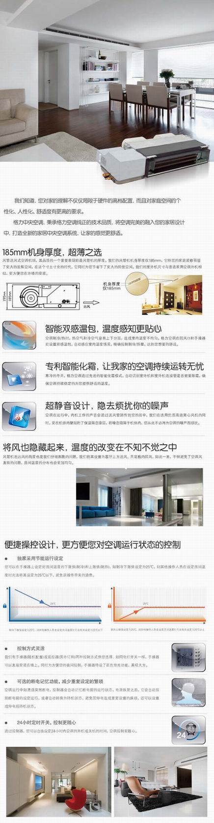 特點:與普通分體式空調相比較,家用中央空調有著無可比擬的優勢,(從節能上說家用中央空調直流變頻的基本能效都在國家一級以上,隱藏式風管機能效比基本都在二級以上)它們內機有 擁有嵌入式、卡式、吊頂內隱藏式 落地式等十幾種樣式,每種樣式又有許多型號相對應,送風方式可供選擇的方案要多達數百種。這就給用戶提供了很多選擇機會。它還有許多與室內裝修相配的裝修方案供用戶選擇,能夠真正滿足用戶的個性化需求。